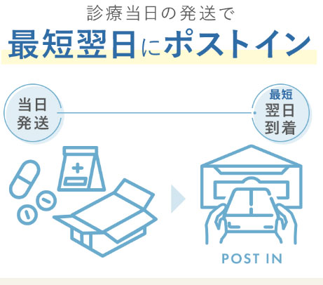 診察後、決済を済ませると、最短で翌日にポストに届きました。急いでいたため、この迅速な対応にはとても助かりました。