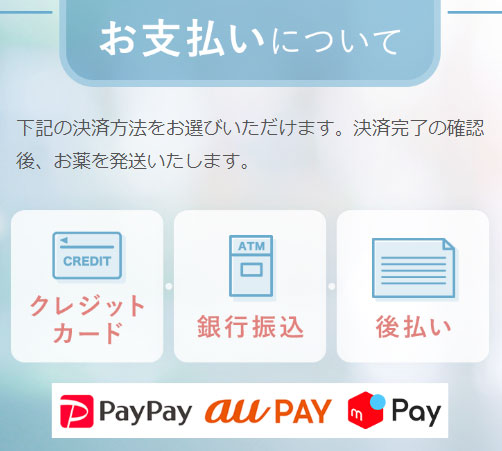 お支払方法は、クレジットカード・銀行振込・後払い・PayPay・au Pay・メルペイが利用できます。