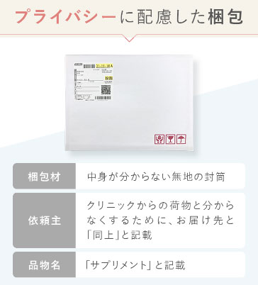 また、ご家族や周りの人に低用量ピルを利用していることを知られたくないという方も気軽に利用できるよう、中身のわからないシンプルな無地の封筒に、荷物の品名「サプリメント」、依頼主「同上」と記載。